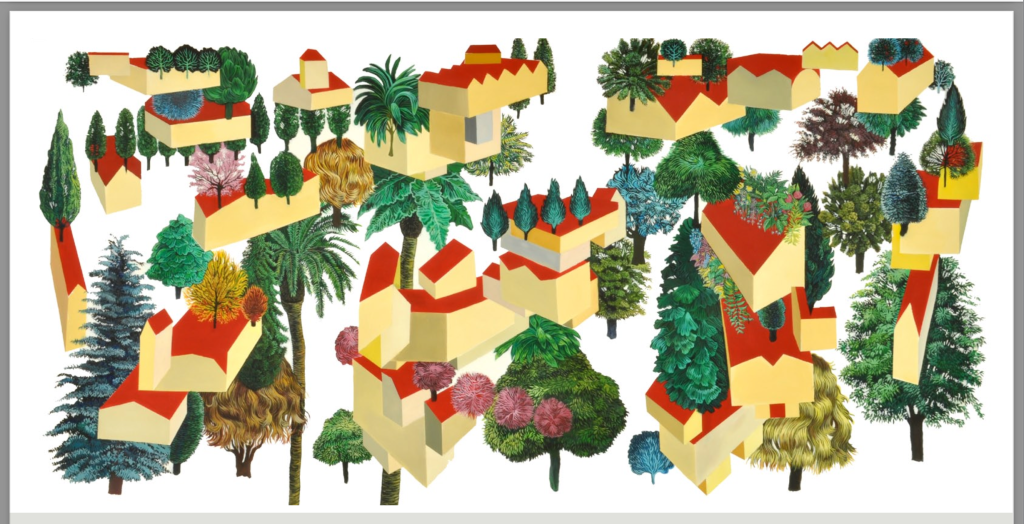 Un troisième format (Perspective rabattue,), peint celui-ci, et dans des couleurs vives, s’en prend au paysage, isolant de mêmes arbres et bâtiments en un curieux enchevêtrement de motifs. Chaque arbre, chaque architecture, flotte littéralement dans le tableau en des signes génériques, comme « baignant dans la lumière de leur absence d’explication », selon l’expression du cinéaste portugais Manoel de Oliveira. On pense là encore à un catalogue, une planche encyclopédique. Mais à observer plus longuement, quelque chose trouble encore : dans l’échelonnement des plans qui fait la perspective du proche au lointain, se joue comme un retournement. Les petits arbres cachent les grands, et les architectures ont des curieuses façons d’axonométrie retroussée. Sur la toile les choses se sont inversées en un monde improbable, une vision hallucinée. Et là encore : ce jeu de glissements dans les objets eux-mêmes. Si les bâtiments arborent le dessin stéréotypé de façades ocres coiffées de pentes rouges, les arbres semblent animés de confusion végétale, combinant la précision entomologiste du dessin au croisement facétieux des espèces. Ce sont palmiers aux feuilles de laitues, artichauts, choux, et même chevelures invitées, par affinité de formes sans doute, et qui font là encore une sorte de table botanique et capillaire. S’il vous arrive de passer voir au nord-est de la Sicile le musée régional de Messine, ville où naquît l’excellent Antonello, vous verrez certainement ce curieux tableau d’un anonyme flamand (fin XVème) étalant tout autour de la croix du supplice les symboles de la passion : des signes comme un rébus, pareillement flottant, presque ludiques. Face à la toile, c’est à ce tableau que je pense.