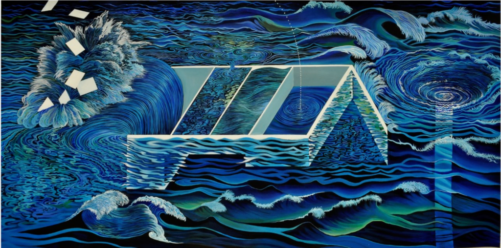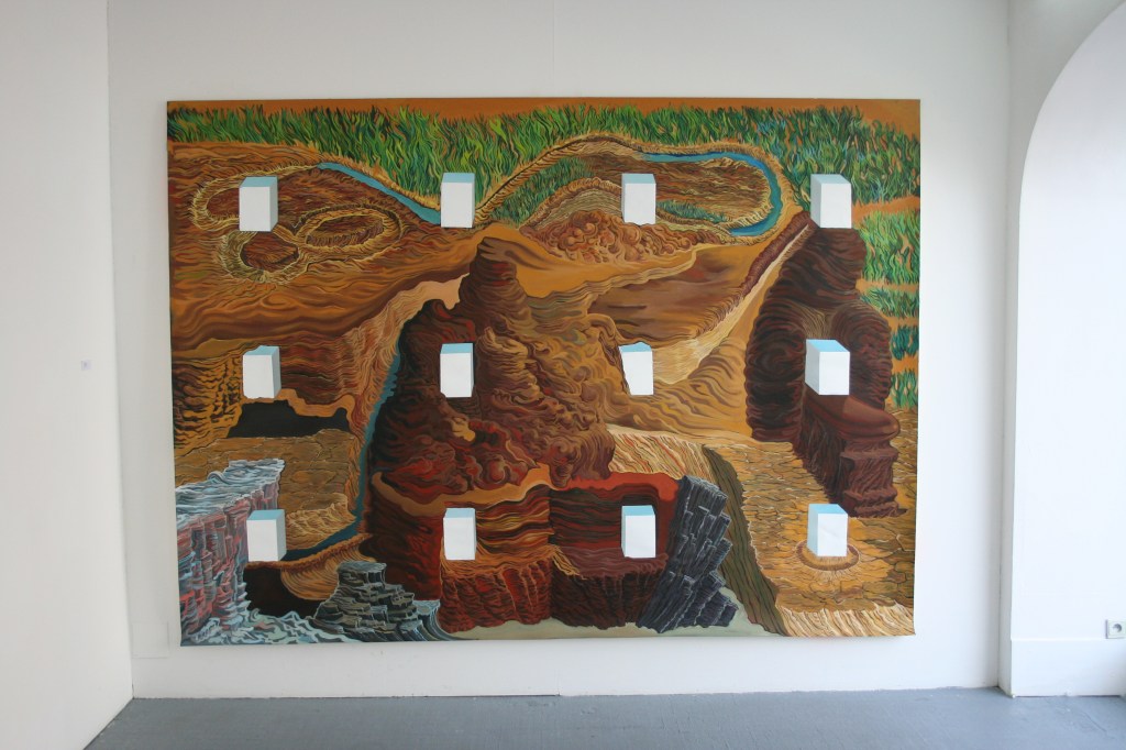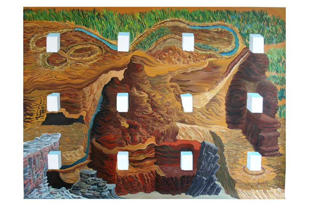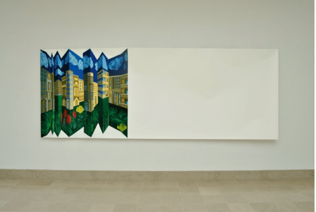 Enfin, l’ultime tableau laisse tout aussi interloqué (Panoramique). On dirait là, croisement de la miniature persane et d’une vue sophistiquée de Escher. Dans le tableau, figurée, une vue urbaine pliée comme un paravent. Le décor est minutieusement rendu dans des teintes irréelles, évoquant un peu le Douanier Rousseau ou les riches miniatures écœurantes de détails, entre kitch et surréalisme. «Mignonneries», nous a confessé Genco, à propos de cette manière soignée et anecdotique, quelque peu condamnable. Chaque élément du tableau est ourlé comme une mignardise. Se dégage l’idée, jusqu’ici esquissée, que les tableaux de Genco jouent en lisière du bon goût. Le mignon, corollaire de l’ornement, est-ce crime aux yeux de l’art ?