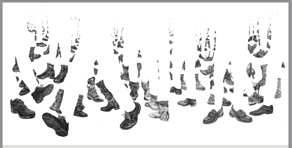 Ils surprennent, pour sûr, ces six formats que l’artiste distribue au regard. Pareils aux sculptures dont j’ai parlé un peu, ils ouvrent comme une scène sur laquelle le monde « fictionne », s’extrapole. Semblables aussi en cela qu’ils ne semblent se donner à lire autrement que comme des jeux. « Jeux », comme on dit d’une mécanique dont les pièces ont quelques latitudes dans leur rôle. Ce qui est figuré, c’est un mouvement du réel en lui-même. Ainsi de ces deux crayonnés qui mettent en scènes une foule de chaussures extraites par détourage du contexte dans lequel on les observe (Chaussures aux pieds ou Chaussures sur boîtes à chaussures , p 33- 35) pour devenir motifs d’un grand all-over. La scène a l’étrangeté des tableaux de Cueco qui accumulent les chiens en meutes, incline au recensement, au répertoire de formes (Cueco se dit lui-même enclin à la collection, collectionneur de collections). Des modèles bientôt se suggèrent d’eux-mêmes en une sorte d’engendrement biomorphique ; ce sont des portraits loufoques de chaussures qui se rêvent. Là encore cette vie des objets, personnification débridée, ce fétichisme, appellent l’imaginaire surréaliste, lequel a fait grand usage de chapeaux et de mannequins.