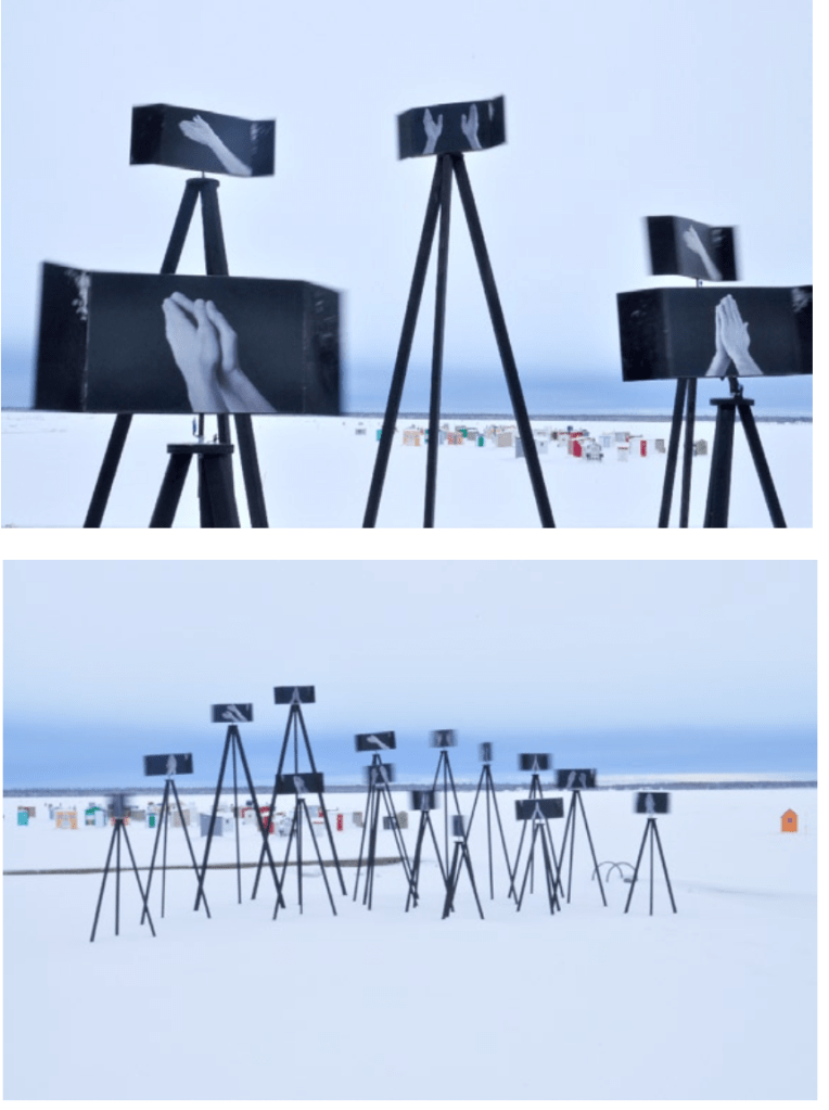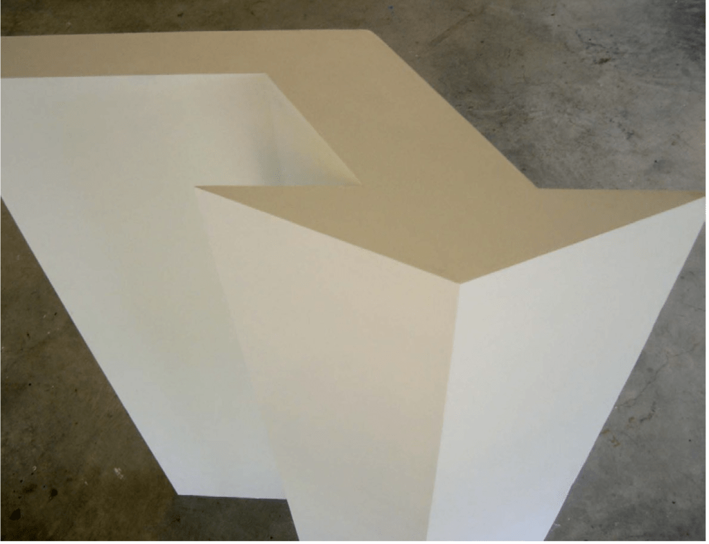 L’élévation d’un tracé de parking (En attendant le printemps ) fait de l’image un volume lequel vient faire pour la neige qui tombe comme un socle tandis qu’il entrave le véhicule garé qui semble alors en hivernage. On ne sait comment s’est initié l’histoire, ni ce qui demeure de ce petit coq- à-l’âne. On a du mal à dire ce qui fait tenir l’image durablement malgré sa légèreté, sinon cette indétermination qui suspend un moment les choses pour former une attirance confuse, esquisser une gravitation. C’est, je crois, dans ce trouble que la poésie se fait critique. Et critique, d’abord, du système d’énonciation qui la fonde. C’est ainsi que nous pouvons comprendre une pièce comme « tourner en rond pour tourner à droite » (ci-dessous) ; silhouette anguleuse et blanche, dressée comme un paravent, qu’un regard plongeant nous révèle être l’élévation dans l’espace d’une flèche de rabattement. La signalétique familière prend des apparences énigmatiques et le discours pourra se prendre longtemps à butter sur cette forme et à tourner autour sans percevoir l’évidence simple qui est en jeu. Est-ce à dire que le discours n’épuise pas l’évidence ? Ou, plus encore, que le discours ne fait toujours que tourner autour du réel et sans jamais l’atteindre ? Ce mélange de vérité et de fantaisie au-delà du langage n’est-ce pas ce qui fait les rêves ? Et les rêves ne sont-ils pas la manière la plus riche d’aborder le monde ?