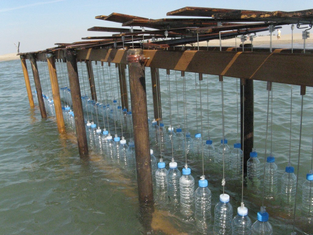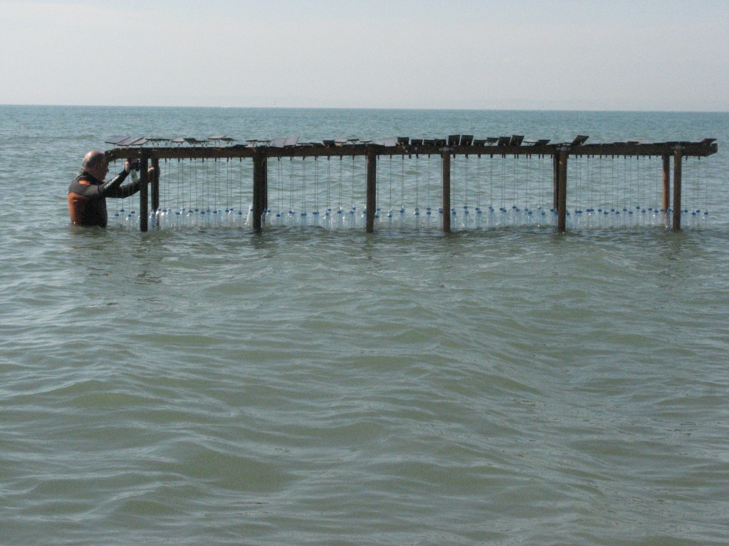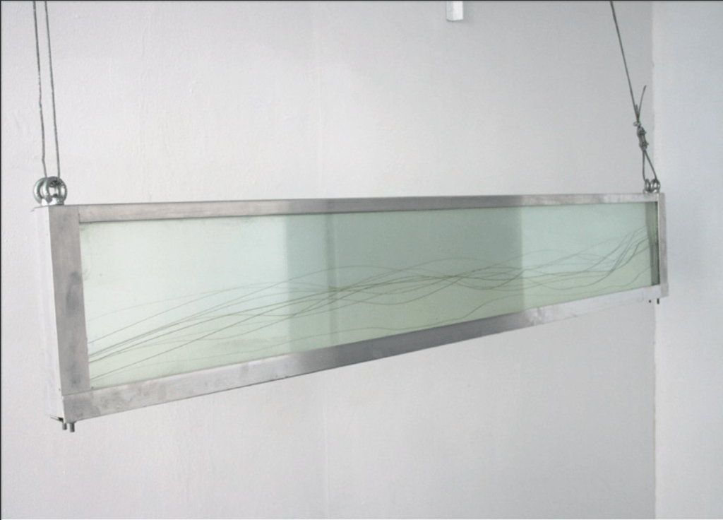 L’art de Vincent Genco consiste en des gestes simples, de petits déplacements et mariages, qui fournissent des images ou des situations qu’on a du mal à dire. Sinon de décrire ce qu’elles mettent en scène : un ponton dont les lattes disjointes battent comme un clavier au rythme de la houle (Arpèges, ci-dessus) et qui évoque avec un air bonhomme cette harpe éolienne qui inspirait les romantiques de Caspard David Friedrich à Henri Fantin-Latour et les rendait rêveurs. Une autre fois, ce sont des fontaines qui animent une flaque, comme un petit Versailles aux grandes eaux dérisoires nourrissant la boue qui les cerne (Après la pluie).