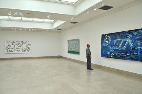 une sorte de table botanique et capillaire. S’il vous arrive de passer voir au nord-est de la Sicile le musée régional de Messine, ville où naquît l’excellent Antonello, vous verrez certainement ce curieux tableau d’un anonyme flamand (fin XVème) étalant tout autour de la croix du supplice les symboles de la passion : des signes comme un rébus, pareillement flottant, presque ludiques. Face à la toile, c’est à ce tableau que je pense. Sur le quatrième format qu’il nous est permis d’observer (Gesticulations, p 39), combinés en un affreux tableau, c’est un déluge scientifique, le recensement exhaustif de toutes les apparences de l’eau sous la forme d’un schéma épouvantable comme seules savent en fournir les manuels scolaires. La manière rappelle les fictions glauques de Monory, et l’ensemble fait une bataille étonnante, un récit mécanique comme en firent Man Ray ou Duchamp ou, mieux,