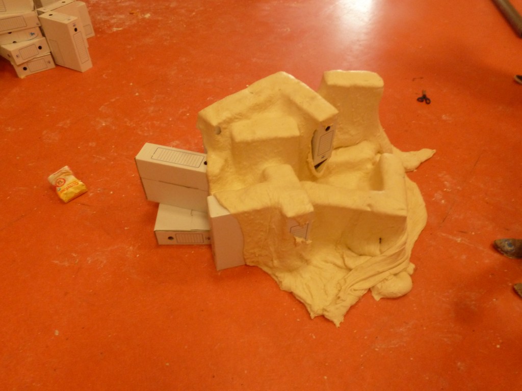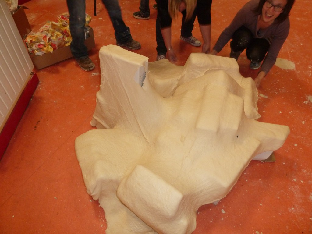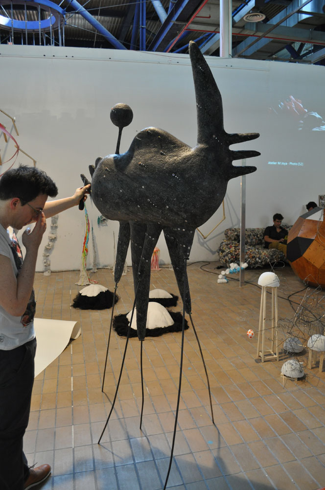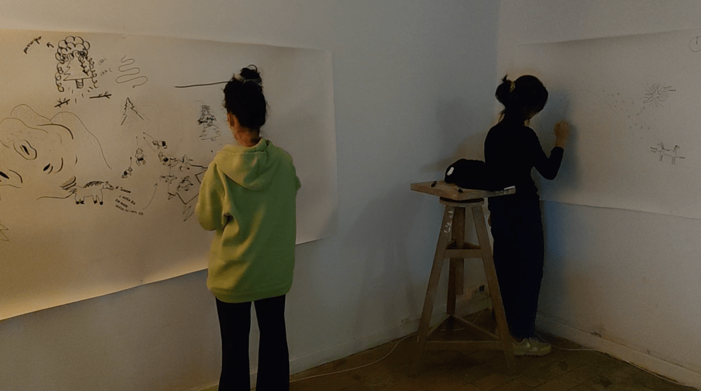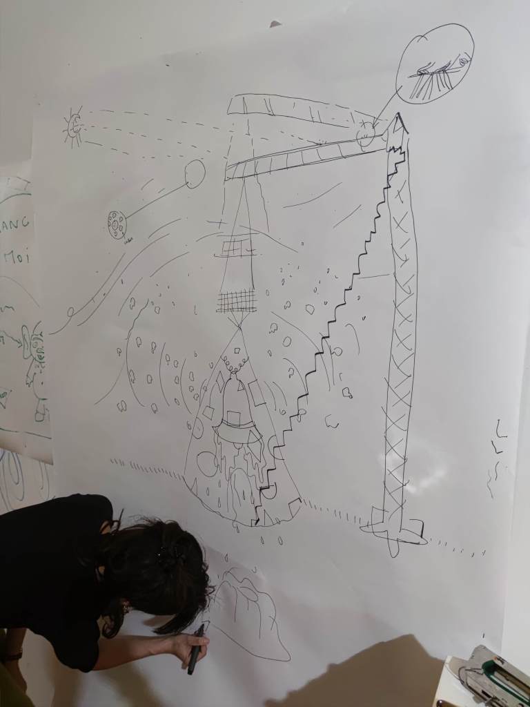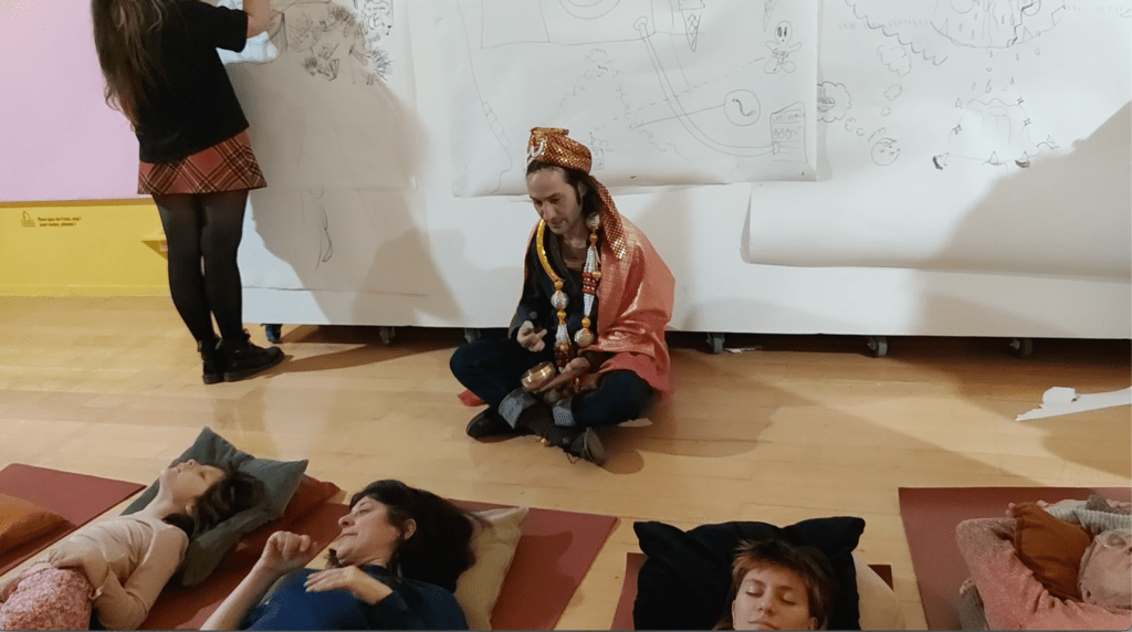 Un guide accompagne un groupe de participants lors d’une séance de visualisation. Ceux-ci sont allongés, yeux fermés. Ils tentent de décrire une forme géométrique à un dessinateur qui s’efforce de la modéliser sous forme d’esquisse. L’objet imaginé est réalisé ensuite à l’atelier. (ici : Workshop MacSup, au Musée d’art contemporain de Lyon, groupe constitué d’enseignants ENSAT et ENS, ainsi que leurs étudiants)
