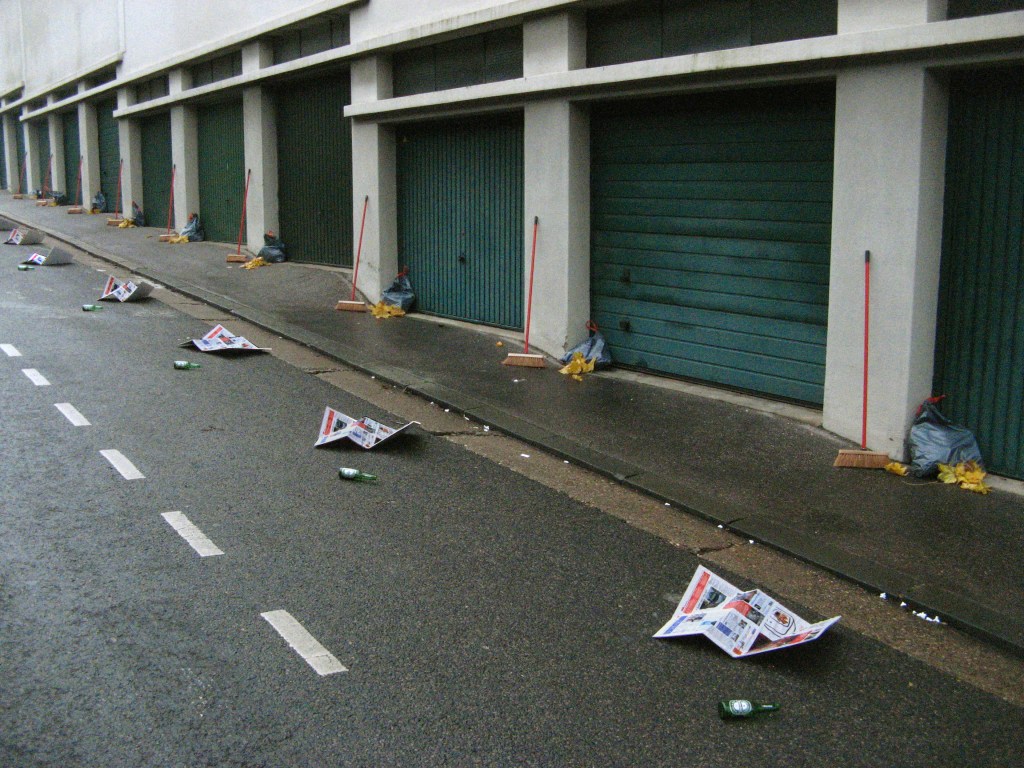 Copropriété / 15 balais, 15 sacs, 15 bouteilles, 15 journeaux contrecollés (Lyon)