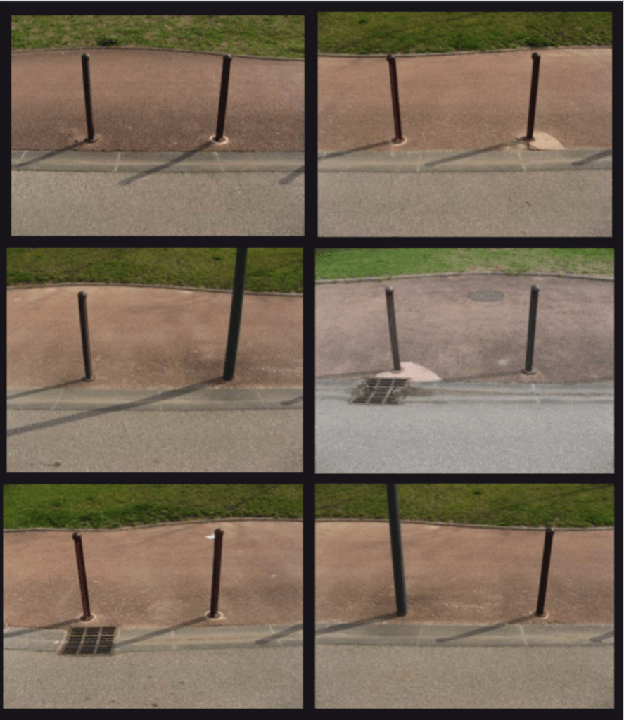 Dans la continuité de cette logique, on serait tenté de dissoudre complètement le signe émis par ces installations dans un arrière-fond d’indifférence. Dans ce cas, le seul moyen dont je puisse disposer pour rendre l’objet perceptible, serait de le répéter en de multiples parcelles afin de produire des impressions de déjà-vu dans l’esprit de l’habitant en transit à proximité.